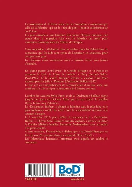 La colonisation de l'Orient arabe par les Européens a commencé par celle de la Palestine, qui est la « tête de pont » pour la colonisation de cet Orient.Les pays européens, qui luttaient déjà contre l'Empire ottoman, ont trouvé dans la migration juive vers la Palestine un motif pour s'immiscer davantage dans les Affaires de l'Empire.Cette migration a déclenché chez les Arabes, dont les Palestiniens, la conscience que les juifs sont venus de l'extérieur, en éclaireurs, pour occuper leurs pays.La résistance arabe commença alors à prendre forme sans jamais s'éteindre.En pleine guerre (1914-1918), la Grande Bretagne et la France se partagent la Syrie, le Liban, la Jordanie et l'Iraq (Accords Sykes-Picot-1916). Et la Grande Bretagne favorise la création d'un foyer national pour les juifs en Palestine (Déclaration Balfour-1917).Le but visé est l'empêchement de l'émancipation d'un Etat arabe qui comblerait le vide créé par la disparition de l'Empire ottoman.L'ombre des «Accords Sykes-Picot» et de la «Déclaration Balfour» règne jusqu'à nos jours sur l'Orient Arabe qui n'a pas trouvé de stabilité (Syrie, Liban, Iraq, Palestine).La «Déclaration Balfour» a plongé la Palestine dans le plus long et le plus douloureux conflit du siècle, dont la responsabilité incombe à la Grande-Bretagne.Le 2 novembre 2017, pour célébrer le centenaire de la « Déclaration Balfour », Theresa May, Première ministre anglaise, a invité à un diner le Premier Ministre israélien Benyamin Nethanyahou, avec au moins 150 personnalités.A cette occasion, Theresa May a déclaré que « la Grande-Bretagne est fière de son rôle pionnier dans la création de l'Etat d'Israël ».Les Palestiniens dénoncent l'arrogance avec laquelle est célébré le centenaire.
