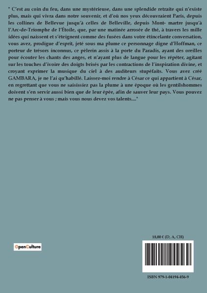 " C¿est au coin du feu, dans une mystérieuse, dans une splendide retraite qui n¿existe plus, mais qui vivra dans notre souvenir, et d¿où nos yeux découvraient Paris, depuis les collines de Bellevue jusqüà celles de Belleville, depuis Mont- martre jusqüà l¿Arc-de-Triomphe de l¿Étoile, que, par une matinée arrosée de thé, à travers les mille idées qui naissent et s¿éteignent comme des fusées dans votre étincelante conversation, vous avez, prodigue d¿esprit, jeté sous ma plume ce personnage digne d¿Hoffman, ce porteur de trésors inconnus, ce pèlerin assis à la porte du Paradis, ayant des oreilles pour écouter les chants des anges, et n¿ayant plus de langue pour les répéter, agitant sur les touches d¿ivoire des doigts brisés par les contractions de l¿inspiration divine, et croyant exprimer la musique du ciel à des auditeurs stupéfaits. Vous avez créé GAMBARA, je ne l¿ai qühabillé. Laissez-moi rendre à César ce qui appartient à César, en regrettant que vous ne saisissiez pas la plume à une époque où les gentilshommes doivent s¿en servir aussi bien que de leur épée, afin de sauver leur pays. Vous pouvez ne pas penser à vous ; mais vous nous devez vos talents...."