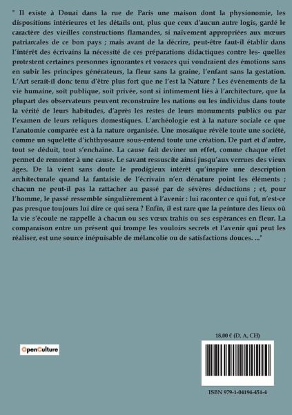 " Il existe à Douai dans la rue de Paris une maison dont la physionomie, les dispositions intérieures et les détails ont, plus que ceux d¿aucun autre logis, gardé le caractère des vieilles constructions flamandes, si naïvement appropriées aux m¿urs patriarcales de ce bon pays ; mais avant de la décrire, peut-être faut-il établir dans l¿intérêt des écrivains la nécessité de ces préparations didactiques contre les- quelles protestent certaines personnes ignorantes et voraces qui voudraient des émotions sans en subir les principes générateurs, la fleur sans la graine, l¿enfant sans la gestation. L¿Art serait-il donc tenu d¿être plus fort que ne l¿est la Nature ? Les événements de la vie humaine, soit publique, soit privée, sont si intimement liés à l¿architecture, que la plupart des observateurs peuvent reconstruire les nations ou les individus dans toute la vérité de leurs habitudes, d¿après les restes de leurs monuments publics ou par l¿examen de leurs reliques domestiques. L¿archéologie est à la nature sociale ce que l¿anatomie comparée est à la nature organisée. Une mosaïque révèle toute une société, comme un squelette d¿ichthyosaure sous-entend toute une création. De part et d¿autre, tout se déduit, tout s¿enchaîne. La cause fait deviner un effet, comme chaque effet permet de remonter à une cause. Le savant ressuscite ainsi jusqüaux verrues des vieux âges. De là vient sans doute le prodigieux intérêt qüinspire une description architecturale quand la fantaisie de l¿écrivain n¿en dénature point les éléments ; chacun ne peut-il pas la rattacher au passé par de sévères déductions ; et, pour l¿homme, le passé ressemble singulièrement à l¿avenir : lui raconter ce qui fut, n¿est-ce pas presque toujours lui dire ce qui sera ? Enfin, il est rare que la peinture des lieux où la vie s¿écoule ne rappelle à chacun ou ses v¿ux trahis ou ses espérances en fleur. La comparaison entre un présent qui trompe les vouloirs secrets et l¿avenir qui peut les réaliser, est une source inépuisable de mélancolie ou de satisfactions douces. ..."