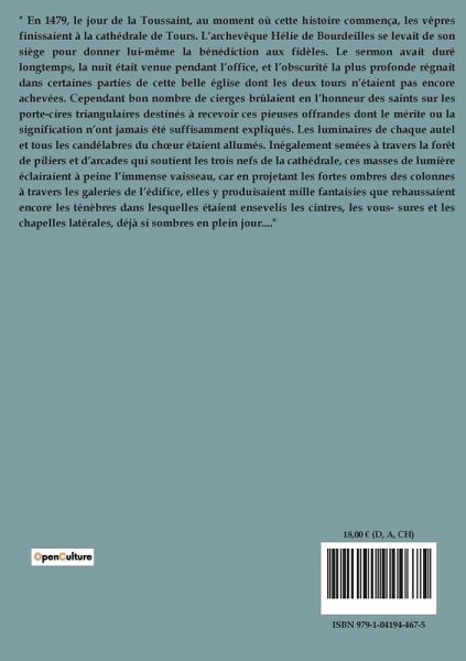 " En 1479, le jour de la Toussaint, au moment où cette histoire commença, les vêpres finissaient à la cathédrale de Tours. L¿archevêque Hélie de Bourdeilles se levait de son siège pour donner lui-même la bénédiction aux fidèles. Le sermon avait duré longtemps, la nuit était venue pendant l¿office, et l¿obscurité la plus profonde régnait dans certaines parties de cette belle église dont les deux tours n¿étaient pas encore achevées. Cependant bon nombre de cierges brûlaient en l¿honneur des saints sur les porte-cires triangulaires destinés à recevoir ces pieuses offrandes dont le mérite ou la signification n¿ont jamais été suffisamment expliqués. Les luminaires de chaque autel et tous les candélabres du ch¿ur étaient allumés. Inégalement semées à travers la forêt de piliers et d¿arcades qui soutient les trois nefs de la cathédrale, ces masses de lumière éclairaient à peine l¿immense vaisseau, car en projetant les fortes ombres des colonnes à travers les galeries de l¿édifice, elles y produisaient mille fantaisies que rehaussaient encore les ténèbres dans lesquelles étaient ensevelis les cintres, les vous- sures et les chapelles latérales, déjà si sombres en plein jour...."