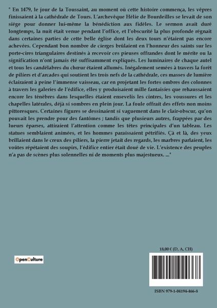 " En 1479, le jour de la Toussaint, au moment où cette histoire commença, les vêpres finissaient à la cathédrale de Tours. L¿archevêque Hélie de Bourdeilles se levait de son siége pour donner lui-même la bénédiction aux fidèles. Le sermon avait duré longtemps, la nuit était venue pendant l¿office, et l¿obscurité la plus profonde régnait dans certaines parties de cette belle église dont les deux tours n¿étaient pas encore achevées. Cependant bon nombre de cierges brûlaient en l¿honneur des saints sur les porte-cires triangulaires destinés à recevoir ces pieuses offrandes dont le mérite ou la signification n¿ont jamais été suffisamment expliqués. Les luminaires de chaque autel et tous les candélabres du ch¿ur étaient allumés. Inégalement semées à travers la forêt de piliers et d¿arcades qui soutient les trois nefs de la cathédrale, ces masses de lumière éclairaient à peine l¿immense vaisseau, car en projetant les fortes ombres des colonnes à travers les galeries de l¿édifice, elles y produisaient mille fantaisies que rehaussaient encore les ténèbres dans lesquelles étaient ensevelis les cintres, les voussures et les chapelles latérales, déjà si sombres en plein jour. La foule offrait des effets non moins pittoresques. Certaines figures se dessinaient si vaguement dans le clair-obscur, qüon pouvait les prendre pour des fantômes ; tandis que plusieurs autres, frappées par des lueurs éparses, attiraient l¿attention comme les têtes principales d¿un tableau. Les statues semblaient animées, et les hommes paraissaient pétrifiés. Çà et là, des yeux brillaient dans le creux des piliers, la pierre jetait des regards, les marbres parlaient, les voûtes répétaient des soupirs, l¿édifice entier était doué de vie. L¿existence des peuples n¿a pas de scènes plus solennelles ni de moments plus majestueux. ..."