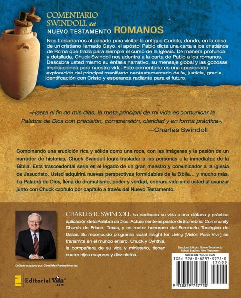 Comentario Swindoll del Nuevo Testamento: Romanos es una obra de gran valor hist¿¿rico y teol¿¿gico. Contiene un comentario de la m¿¿s larga de las ep¿¿stolas paulinas y que es considerada su legado teol¿¿gico m¿¿s importante, la Ep¿¿stola a los Romanos. Con un enfoque fresco y perteneciente a la luz de las necesidades de hoy, el autor logra simplificar Romanos, un texto desafiante y complejo, en un examen comprensible y pragm¿¿tico de cada pasaje, utilizando m¿¿ltiples apoyos visuales que llevar¿¿n al lector al momento y lugar de los hechos. Este libro es una actualizaci¿¿n del original por el mismo autor Swindoll, con el prop¿¿sito de que el lector aplique esta sabidur¿¿a en su vida. Incluye: Comentario Swindoll del Nuevo Testamento, Romanos. Contenido teol¿¿gico e hist¿¿rico. Contexto hist¿¿rico y cultural de la carta de Pablo a los Romanos. Mapas, l¿¿neas de tiempo, tablas y cuadros. Analog¿¿as y an¿¿cdotas personales. Aplicaciones actuales. Citas B¿¿blicas: la Nueva Versi¿¿n Internacional (NVI). Swindoll Commentary on the New Testament: Romans Swindoll Commentary on the New Testament: Romans is a work of great historical and theological value. It contains a commentary on the longest of the Pauline epistles which is considered his most important theological legacy, the Epistle to the Romans. With a fresh approach and pertaining to the light of today's needs, the author manages to simplify Romans, a challenging and complex text, in an understandable and pragmatic examination of each passage, using multiple visual aids that will take the reader to the moment and place of the facts. This book is an update of the original by the same author Swindoll, written for the reader to apply this wisdom in his life. It includes: Swindoll Commentary on the New Testament, Romans. Theological and historical content. Historical and cultural context of Paul's letter to the Romans. Maps, timelines, tables and charts. Analogies and personal anecdotes. Current applications. Biblical quotes: la Nueva Versi¿¿n Internacional (NVI).