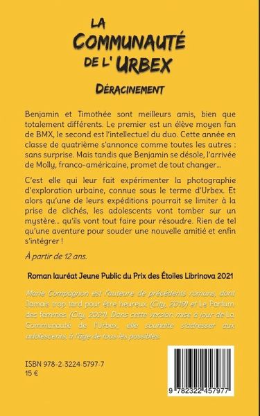 Benjamin et Timothée sont meilleurs amis, bien que totalement différents. Le premier est un élève moyen fan de BMX, le second est l'intellectuel du duo. Cette année en classe de quatrième s'annonce comme toutes les autres : sans surprise. Mais tandis que Benjamin se désole, l'arrivée de Molly, franco-américaine, promet de tout changer... C'est elle qui leur fait expérimenter la photographie d'exploration urbaine, connue sous le terme d'Urbex. Et alors qu'une de leurs expéditions pourrait se limiter à la prise de clichés, les adolescents vont tomber sur un mystère... qu'ils vont tout faire pour résoudre. Rien de tel qu'une aventure pour souder une nouvelle amitié et enfin s'intégrer !A partir de 12 ans. Roman Lauréat Jeune Public du Prix des Étoiles Librinova.
