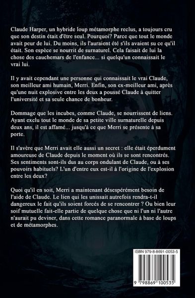 Claude Harper, un hybride loup métamorphe reclus, a toujours cru que son destin était d'être seul. Pourquoi? Parce que tout le monde avait peur de lui. Du moins, ils l'auraient été s'ils avaient su ce qu'il était. Son espèce se nourrit de surnaturel. Cela faisait de lui la chose des cauchemars de l'enfance... si quelqu'un connaissait le vrai lui. Il y avait cependant une personne qui connaissait le vrai Claude, son meilleur ami humain, Merri. Enfin, son ex-meilleur ami, après qu'une nuit explosive entre les deux a poussé Claude à quitter l'université et sa seule chance de bonheur. Dommage que les incubes, comme Claude, se nourrissent de liens. Ayant exclu tout le monde de sa petite ville surnaturelle depuis deux ans, il est affamé... jusqu'à ce que Merri se présente à sa porte. Il s'avère que Merri avait elle aussi un secret : elle était éperdument amoureuse de Claude depuis le moment où ils se sont rencontrés. Ses sentiments sont-ils dus au corps ondulant de Claude, ou à ses pouvoirs habituels? L'un d'entre eux est-il à l'origine de l'explosion entre les deux? Quoi qu'il en soit, Merri a maintenant désespérément besoin de l'aide de Claude. Le lien qui les unissait autrefois rendra-t-il dangereux le fait qu'ils soient forcés de se rencontrer ? Ou bien leur soif mutuelle fait-elle partie de quelque chose que ni l'un ni l'autre n'aurait pu deviner, dans cette romance paranormale à base de loups et de métamorphes. Note: Ce livre fait partie de la collection L'amour c'est l'amour de l'auteur, ce qui signifie qu'il est disponible en tant que romance épicée dans Ma Deuxième Chance, en tant que romance torride entre loups et métamorphes dans La compagne retrouvée du loup solitaire, en tant que romance homme/homme dans Problème de la deuxième chance, et en tant que romance entre loups et métamorphes dans Son Loup Affamé