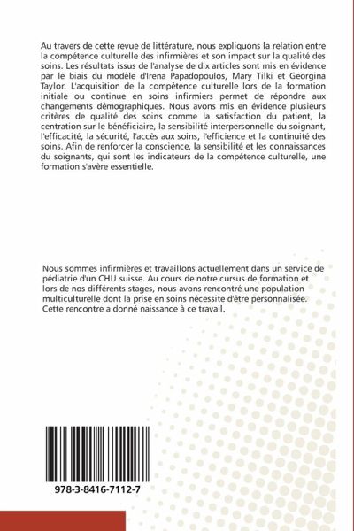 Au travers de cette revue de littérature, nous expliquons la relation entre la compétence culturelle des infirmières et son impact sur la qualité des soins. Les résultats issus de l'analyse de dix articles sont mis en évidence par le biais du modèle d'Irena Papadopoulos, Mary Tilki et Georgina Taylor. L'acquisition de la compétence culturelle lors de la formation initiale ou continue en soins infirmiers permet de répondre aux changements démographiques. Nous avons mis en évidence plusieurs critères de qualité des soins comme la satisfaction du patient, la centration sur le bénéficiaire, la sensibilité interpersonnelle du soignant, l'efficacité, la sécurité, l'accès aux soins, l'efficience et la continuité des soins. Afin de renforcer la conscience, la sensibilité et les connaissances du soignants, qui sont les indicateurs de la compétence culturelle, une formation s'avère essentielle.