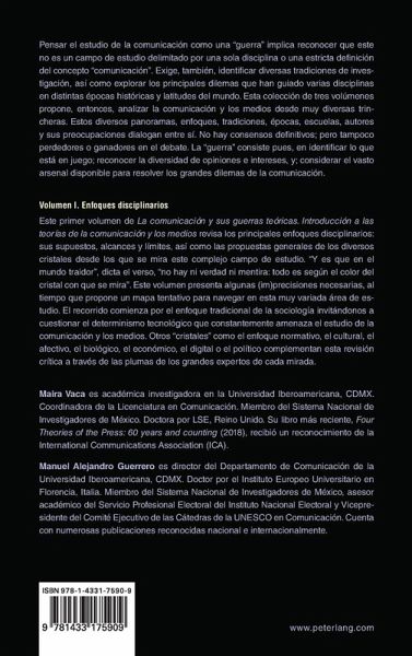 Pensar el estudio de la comunicación como una "guerra" implica reconocer que este no es un campo de estudio delimitado por una sola disciplina o una estricta definición del concepto "comunicación". Exige, también, identificar diversas tradiciones de investigación, así como explorar los principales dilemas que han guiado varias disciplinas en distintas épocas históricas y latitudes del mundo. Esta colección de tres volúmenes propone, entonces, analizar la comunicación y los medios desde muy diversas trincheras. Estos diversos panoramas, enfoques, tradiciones, épocas, escuelas, autores y sus preocupaciones dialogan entre sí. No hay consensos definitivos; pero tampoco perdedores o ganadores en el debate. La "guerra" consiste pues, en identificar lo que está en juego; reconocer la diversidad de opiniones e intereses, y; considerar el vasto arsenal disponible para resolver los grandes dilemas de la comunicación. Volumen I. Enfoques disciplinarios Este primer volumen de La comunicación y sus guerras teóricas. Introducción a las teorías de la comunicación y los medios revisa los principales enfoques disciplinarios: sus supuestos, alcances y límites, así como las propuestas generales de los diversos cristales desde los que se mira este complejo campo de estudio. "Y es que en el mundo traidor", dicta el verso, "no hay ni verdad ni mentira: todo es según el color del cristal con que se mira". Este volumen presenta algunas (im)precisiones necesarias, al tiempo que propone un mapa tentativo para navegar en esta muy variada área de estudio. El recorrido comienza por el enfoque tradicional de la sociología invitándonos a cuestionar el determinismo tecnológico que constantemente amenaza el estudio de la comunicación y los medios. Otros "cristales" como el enfoque normativo, el cultural, el afectivo, el biológico, el económico, el digital o el político complementan esta revisión crítica a través de las plumas de los grandes expertos de cada mirada.
