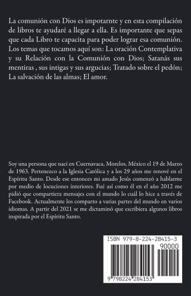La comunión con Dios es impotarnte y en esta compilación de libros te ayudaré a llegar a ella. Es importante que sepas que cada Libro te capacita para poder lograr esa comunión. Los temas que tocamos aquí son: La oración Contemplativa y su Relación con la Comunión con Dios; Satanás sus mentiras , sus intigas y sus argucias; Tratado sobre el pedón; La salvación de las almas; El amor.