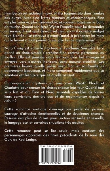 Finn Beran est séduisant, sexy, et il a toujours été dans l'ombre des autres. Avec cinq frères frimeurs et charismatiques, Finn est plus réservé, plus raisonnable, et souvent laissé sur le banc de touche. Quand son frère Wyatt l'appelle pour lui demander un service, il sait qu'il devrait refuser... mais il accepte malgré tout. Bientôt, il se retrouve devant l'autel, à prononcer les mots qui le lieront à tout jamais à une jolie brune mystérieuse. Nora Craig est entre le marteau et l'enclume. Son père lui a donné un choix simple : prendre Finn comme partenaire, ou souffrir. Elle est poussée dans les bras d'un bel étranger et envoyée vers d'autres horizons, sans aucune stabilité. Les premières heures qu'elle passe avec Finn et sa famille lui apprennent beaucoup, et Nora comprend rapidement que sa situation est bien pire que ce qu'elle pensait. Quiproquos et mystères en vue, avec Wyatt, Noah et Charlotte pour remuer les choses chacun leur tour. Quand tout sera fait et dit, Finn et Nora seront-ils capables de laisser leurs convictions derrière eux et de recommencer depuis le début ? Cette romance érotique d'ours-garous parle de passion sauvage, d'attaches émotionnelles et de deuxièmes chances. Réservé aux plus de 18 ans pour l'action sensuelle et sexuelle, le langage osé, et certaines situations très adultes. Cette romance peut se lire seule, mais contient des personnages appréciés des titres précédents de la série des Ours de Red Lodge.