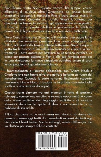 Finn Beran, tanto sexy quanto pacato, ha sempre vissuto all'ombra di qualcun altro. Circondato da cinque fratelli chiassosi e spacconi, il tranquillo Finn è stato spesso messo in secondo piano. Quando suo fratello Wyatt lo chiama per chiedergli un favore, lui accetta... già sapendo che se ne pentirà. E così, si ritrova presto all'altare a pronunciare le fatidiche parole che lo legheranno per sempre a una mora misteriosa. Nora Craig si trova tra l'incudine e il martello. Suo padre le ha affidato una missione: prendere Finn come compagno. Se fallirà, ad aspettarla troverà infinite sofferenze. Nora dunque si getta tra le braccia di un bellissimo sconosciuto e parte verso il tramonto - tutto questo per ritrovarsi su un terreno instabile. Le prime ore passate assieme a Finn e alla sua famiglia sono per lei una rivelazione: la nuova situazione potrebbe essere di gran lunga peggiore di quanto immaginava. I fraintendimenti e i misteri abbondano, con Wyatt, Noah e Charlotte che non fanno altro che gettare benzina sul fuoco del melodramma. Quando le carte verranno finalmente scoperte, riusciranno Finn e Nora a lasciarsi le loro false convinzioni alle spalle e a ricominciare daccapo? Questa storia d'amore tra orsi mannari è fatta di passione selvaggia, connessione emotiva e seconde opportunità. A causa delle scene erotiche, del linguaggio esplicito e di svariate situazioni decisamente spinte, il libro è raccomandato a un pubblico di soli adulti. Il libro che avete tra le mani narra una storia a sé stante che presenta personaggi tratti dai precedenti romanzi dedicati agli Orsi dello Chalet Rosso. Niente imbrogli, niente cliffhanger, ma un classico per sempre felici e contenti!