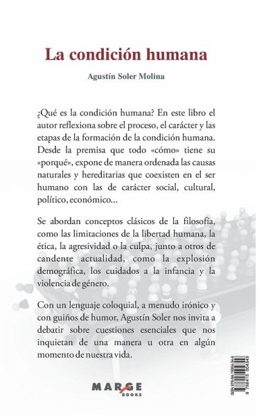 ¿Qué es la condición humana? En este libro el autor reflexiona sobre el proceso, el carácter y las etapas de la formación de la condición humana. Desde la premisa que todo cómo tiene su porqué, expone de manera ordenada las causas naturales y hereditarias que coexisten en el ser humano con las de carácter social, cultural, político, económico... Se abordan conceptos clásicos de la filosofía, como las limitaciones de la libertad humana, la ética, la agresividad o la culpa, junto a otros de candente actualidad, como la explosión demográfica, los cuidados a la infancia y la violencia de género. Con un lenguaje coloquial, a menudo irónico y con guiños de humor, Agustín Soler nos invita a debatir sobre cuestiones esenciales que nos inquietan de una manera u otra en algún momento de nuestra vida.