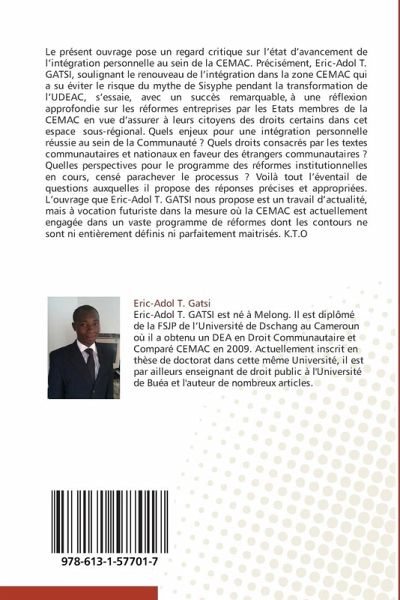 Le présent ouvrage pose un regard critique sur l état d avancement de l intégration personnelle au sein de la CEMAC. Précisément, Eric-Adol T. GATSI, soulignant le renouveau de l intégration dans la zone CEMAC qui a su éviter le risque du mythe de Sisyphe pendant la transformation de l UDEAC, s essaie, avec un succès remarquable, à une réflexion approfondie sur les réformes entreprises par les Etats membres de la CEMAC en vue d assurer à leurs citoyens des droits certains dans cet espace sous-régional. Quels enjeux pour une intégration personnelle réussie au sein de la Communauté ? Quels droits consacrés par les textes communautaires et nationaux en faveur des étrangers communautaires ? Quelles perspectives pour le programme des réformes institutionnelles en cours, censé parachever le processus ? Voilà tout l éventail de questions auxquelles il propose des réponses précises et appropriées. L ouvrage que Eric-Adol T. GATSI nous propose est un travail d actualité, mais à vocation futuriste dans la mesure où la CEMAC est actuellement engagée dans un vaste programme de réformes dont les contours ne sont ni entièrement définis ni parfaitement maitrisés. K.T.O