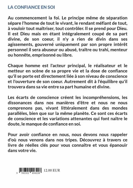 Au commencement la foi. Le principe même de séparation sépare l'homme de tout le vivant, le rendant méfiant de tout, à vouloir tout maîtriser, tout contrôler. Il se prend pour Dieu. Il est Dieu mais en étant intégralement coupé de sa part divine, de son coeur, il n'y a rien de divin dans ses agissements, gouverné uniquement par son propre intérêt personnel il sera abuseur ou abusé, traître ou trahi, menteur ou honnête, emprisonné ou libre. Chaque homme est l'acteur principal, le réalisateur et le metteur en scène de sa propre vie et la dose de confiance qu'il se porte est directement liée à son niveau de conscience et l'ouverture de son coeur. Autrement dit à l'équilibre qu'il trouvera dans sa vie entre sa part humaine et divine. Les écarts de conscience créent les incompréhensions, les dissonances dans nos manières d'être et nous ne nous comprenons pas, vivant littéralement dans des mondes parallèles, bien que sur la même planète. Ce sont ces écarts de conscience et les variations attenantes qui font naître le doute, le manque de confiance en soi. Pour avoir confiance en nous, nous devons nous rappeler d'où nous venons dans nos tripes. Découvrez à travers ce livre de réelles clés pour vous connaître et vous épanouir dans votre vie.