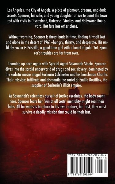 Los Angeles, the City of Angels. A place of glamour, dreams, and dark secrets. Spencer, his wife, and young daughter arrive to paint the town red with visits to Disneyland, Universal Studios, and Hollywood Boulevard. But fate has other plans. Without warning, Spencer is thrust back in time, finding himself lost and alone in the desert of 1961-hungry, thirsty, and desperate. His unlikely savior is Priscilla, a good-time girl with a heart of gold. Yet, Spencer's troubles are far from over. Teaming up once again with Special Agent Savannah Steele, Spencer dives into the sordid underworld of drugs and sex slavery, dominated by the sadistic movie mogul Zacharia Colchester and his henchman Charlie. Their mission: infiltrate and dismantle the cartel of Emilio Bustillos, the supplier of Zacharia's illicit empire. As Savannah's relentless pursuit of justice escalates, the body count rises. Spencer fears her 'win at all costs' mentality might seal their fates. All he wants is to return to his own century, but first, they must survive a deadly mission that could be their last. 'Spencer glanced at the motley assortment of villains, figuring the hierarchy. The older man obviously their leader. A modern-day Fagin. Spencer guessed he was the El Patron to the younger guys, determined to stamp his authority on his admiring proteges. To Spencer he looked like a cartoon character waiting for a caption. 'C'mon guys really, you're out of your depth.'