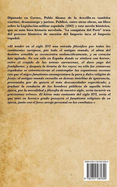 Diputado en Cortes, Pablo Alonso de la Avecilla es también escritor, dramaturgo y jurista. Publicó, entre otras obras, un libro sobre la Legislación militar española (1842) y este novela histórica, que es más bien historia novelada. "La conquista del Perú " trata del proceso histórico de anexión del Imperio inca al Imperio español. Al tender en el siglo XVI una mirada filosófico por todos los continentes europeos, por todo el antiguo mundo, el alma del hombre sensible se reconcentra melancólicamente, y su corazón late agitado. No era sólo en España donde se sintiera con horror, entre el crujido de las armas sarracenas, el duro yugo del feudalismo, y después la tiranía de los reyes; no sólo las comarcas españolas se estremecieran al contemplar las espantosas escenas con que el negro fanatismo ensangrentara la pura y dulce religión de Jesús; el antiguo mundo envuelto en densas tinieblas de ignorancia, presentaba por do quiera el más desconsolador espectáculo; y graduar la conducta de los hombres públicos de aquella triste época, por la moralidad y filosofía de nuestro siglo, sería incurrir en gravísimos errores. El héroe más eminente del siglo XVI, sería el que más en heroico grado poseyera el fanatismo religioso de su época, junto con el feroz arrojo personal en los combates.