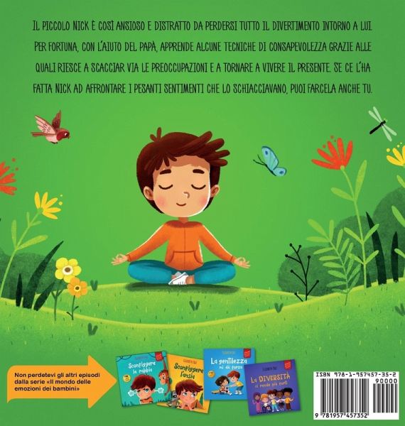 Se tuo figlio è un bambino sconcentrato o ansioso, questo libro è un ottimo modo per fargli comprendere il concetto di mindfulness e dell'essere mindful. Perfetto come uno dei primi libri da leggere, la storia suggerisce più modi per sbarazzarsi dei pensieri che distraggono e insegna a tuo figlio a rimanere concentrato e presente. I genitori spesso fanno fatica a spiegare ai propri figli come affrontare distrazioni, preoccupazioni e rabbia. Questo libro di mindfulness per bambini sarà il miglior regalo per calmare i tuoi figli e mostrargli esercizi per bambini che li aiuteranno a sentirsi felici, concentrati e calmi. Quando il piccolo Nick inizia a percepire un distacco da tutto ciò che accade intorno a lui, suo padre gli insegna ad affrontare le preoccupazioni in modo divertente e giocoso. Usando le tecniche di respirazione per bambini ed altri consigli utili, Nick impara a controllare i suoi sentimenti più potenti e scopre la mindfulness. Questo libro illustrato è adatto sia a bambini in età prescolare sia per bambini dai 6 ai 10 anni, contiene bellissime illustrazioni a mano e rime carine. Aiuterà i tuoi figli a:godersi ogni momento e gioire del mondo che lo circonda; usare i propri sensi e la meditazione per liberarsi dall'ansia; esprimere gentilezza ed empatia verso gli altri; non preoccuparsi e comprendere le sfumature delle emozioni; sfruttare attività di mindfulness per bambini nella sua vita quotidiana. Questo racconto è la continuazione delle avventure di Nick della serie di libri d'infanzia Il mondo delle emozioni dei bambini. *** Anche se pensi di aver provato tutti i metodi, questo libro delle emozioni aiuterà i tuoi piccoli a migliorare le loro capacità di socializzazione ed emotive e li aiuterà a adottare un mindset di crescita nelle loro vite. Non aspettare oltre. Rendi tuo figlio felice, aggiungi questo fantastico libro dei bambini al carrello e DIVERTITEVI ORA, insieme.