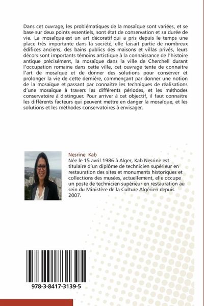 Dans cet ouvrage, les problématiques de la mosaïque sont variées, et se base sur deux points essentiels, sont état de conservation et sa durée de vie. La mosaïque est un art décoratif qui a pris depuis le temps une place très importante dans la société, elle faisait partie de nombreux édifices anciens, des bains publics des maisons et villas privés, leurs décors sont importants témoins artistique à la connaissance de l'histoire antique précisément, la mosaïque dans la ville de Cherchell durant l'occupation romaine dans cette ville, cet ouvrage tente de connaitre l'art de mosaïque et de donner des solutions pour conserver et prolonger la vie de cette dernière, commençant par donner une notion de la mosaïque et passant par connaitre les techniques de réalisations d'une mosaïque à travers les différents périodes, et les méthodes conservatoire à distinguer. Pour arriver à cet objectif, il faut connaitre les différents facteurs qui peuvent mettre en danger la mosaïque, et les solutions et les méthodes conservatoires à envisager.