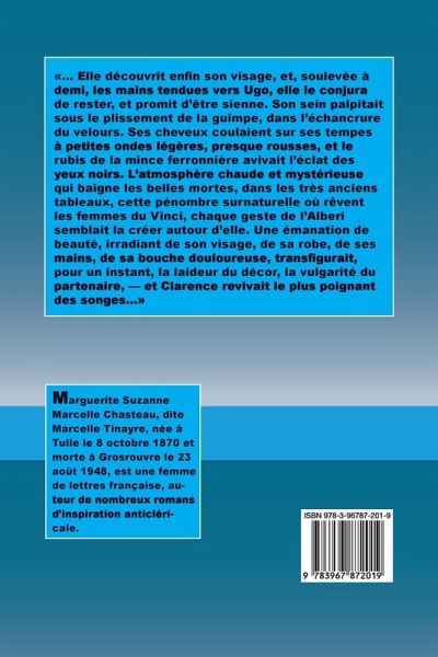 «... Elle découvrit enfin son visage, et, soulevée à demi, les mains tendues vers Ugo, elle le conjura de rester, et promit d'être sienne. Son sein palpitait sous le plissement de la guimpe, dans l'échancrure du velours. Ses cheveux coulaient sur ses tempes à petites ondes légères, presque rousses, et le rubis de la mince ferronnière avivait l'éclat des yeux noirs. L'atmosphère chaude et mystérieuse qui baigne les belles mortes, dans les très anciens tableaux, cette pénombre surnaturelle où rêvent les femmes du Vinci, chaque geste de l'Alberi semblait la créer autour d'elle. Une émanation de beauté, irradiant de son visage, de sa robe, de ses mains, de sa bouche douloureuse, transfigurait, pour un instant, la laideur du décor, la vulgarité du partenaire, - et Clarence revivait le plus poignant des songes...»