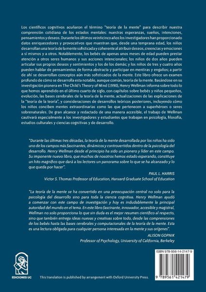 Los científicos cognitivos acuñaron el término "teoría de la mente" para describir nuestra comprensión cotidiana de los estados mentales: nuestras esperanzas, sueños, intenciones, pensamientos y deseos. Durante los últimos veinticinco años los investigadores han proporcionado datos enriquecedores y provocativos que muestran que, desde una temprana edad, los niños desarrollan una teoría de la mente sofisticada y coherente al atribuir deseos, creencias y emociones a sí mismos y a otros. Notablemente, los bebés de apenas unos meses de edad pueden prestar atención a otros seres humanos y sus acciones intencionales; los niños de dos años pueden articular sus propios deseos y sentimientos y los de los demás; y los niños de tres y cuatro años pueden hablar de pensamientos de forma abstracta y participar en mentiras y engaños; a partir de ahí se desarrollan conceptos aún más sofisticados de la mente. Este libro ofrece un examen profundo de cómo se desarrolla esta notable, aunque común, teoría de la mente. Basándose en su investigación pionera en The Child's Theory of Mind (1990), Henry Wellman informa sobre todo lo que hemos aprendido en los últimos veinticinco años, con capítulos sobre bebés y niños pequeños, evolución, las bases cerebrales de la teoría de la mente, actualizaciones de las explicaciones de la "teoría de la teoría", y consideraciones de desarrollos teóricos posteriores, incluyendo cómo los niños conciben mentes extraordinarias como las que pertenecen a superhéroes o seres sobrenaturales. De gran alcance y redactado de una manera accesible, el trabajo de Wellman cautivará especialmente a los investigadores y estudiantes que trabajan en psicología, filosofía, estudios culturales, y ciencias cognitivas y de desarrollo.