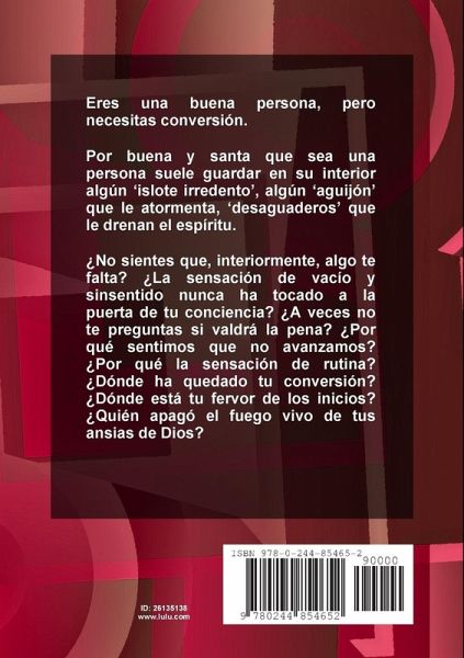Eres una buena persona, pero necesitas conversión. Este libro te dirá por qué y cómo convertirte en tu mejor versión humana y espiritual. Este libro te ayudará a pasar de la bondad a la santidad. Por buena y santa que sea una persona suele guardar en su interior algún 'islote irredento', algún 'aguijón' que le atormenta, 'desaguaderos' que le drenan el espíritu. Puedes ser la persona más correcta, devota e intachable para los demás; y, sin embargo, estar podrido de egoísmo, soberbia, mezquindad, vanidad y presunción por dentro. ¿No sientes que, interiormente, algo te falta? ¿La sensación de vacío y sinsentido nunca ha tocado a la puerta de tu conciencia? ¿A veces no te preguntas si valdrá la pena? ¿Por qué sentimos que no avanzamos? ¿Por qué la sensación de rutina? ¿Dónde ha quedado tu conversión? ¿Dónde está tu fervor de los inicios? ¿Quién apagó el fuego vivo de tus ansias de Dios?
