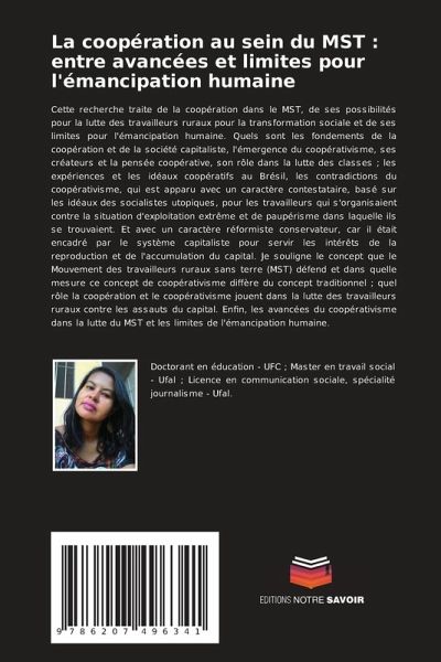 Cette recherche traite de la coopération dans le MST, de ses possibilités pour la lutte des travailleurs ruraux pour la transformation sociale et de ses limites pour l'émancipation humaine. Quels sont les fondements de la coopération et de la société capitaliste, l'émergence du coopérativisme, ses créateurs et la pensée coopérative, son rôle dans la lutte des classes ; les expériences et les idéaux coopératifs au Brésil, les contradictions du coopérativisme, qui est apparu avec un caractère contestataire, basé sur les idéaux des socialistes utopiques, pour les travailleurs qui s'organisaient contre la situation d'exploitation extrême et de paupérisme dans laquelle ils se trouvaient. Et avec un caractère réformiste conservateur, car il était encadré par le système capitaliste pour servir les intérêts de la reproduction et de l'accumulation du capital. Je souligne le concept que le Mouvement des travailleurs ruraux sans terre (MST) défend et dans quelle mesure ce concept de coopérativisme diffère du concept traditionnel ; quel rôle la coopération et le coopérativisme jouent dans la lutte des travailleurs ruraux contre les assauts du capital. Enfin, les avancées du coopérativisme dans la lutte du MST et les limites de l'émancipation humaine.