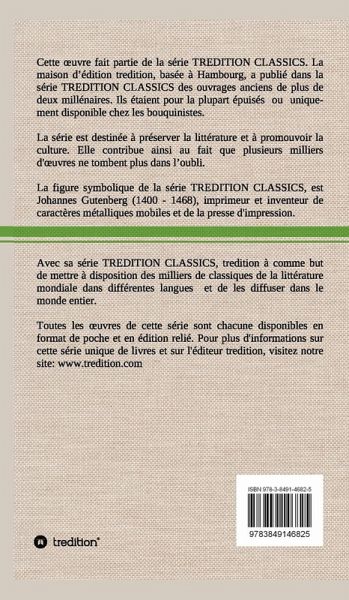 Cette uvre (édition relié) fait partie de la série TREDITION CLASSICS. La maison d édition tredition, basée à Hambourg, a publié dans la série TREDITION CLASSICS des ouvrages anciens de plus de deux millénaires. Ils étaient pour la plupart épuisés ou uniquement disponible chez les bouquinistes. La série est destinée à préserver la littérature et à promouvoir la culture. Avec sa série TREDITION CLASSICS, tredition à comme but de mettre à disposition des milliers de classiques de la littérature mondiale dans différentes langues et de les diffuser dans le monde entier.