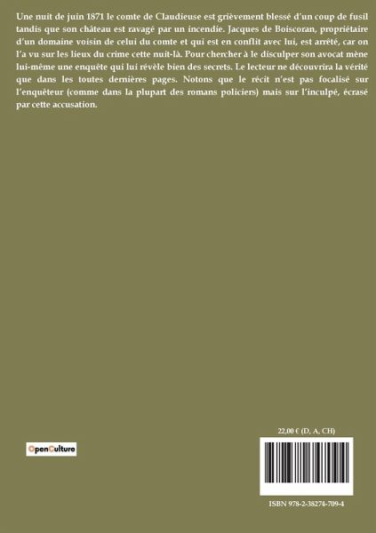 Dans "La Corde au cou" d'Émile Gaboriau, l'histoire débute par un incendie dévastateur au Valpinson, la propriété du comte de Claudieuse, qui met en émoi la ville de Sauveterre. Réveillé en pleine nuit, le maire, M. Séneschal, est informé de l'incendie et de la tentative d'assassinat sur le comte, qui a été blessé par deux coups de fusil. Accompagné du procureur de la République, M. Daubigeon, et du juge d'instruction, M. Galpin-Daveline, le maire se rend sur les lieux pour organiser les secours et enquêter sur le crime. Le comte de Claudieuse, bien que grièvement blessé, parvient à raconter les événements: il a été attaqué alors qu'il sortait de chez lui pour voir l'incendie. Sa femme, la comtesse de Claudieuse, décrit comment elle a découvert son mari blessé et a appelé à l'aide. L'enquête est compliquée par le manque de témoins directs, mais un jeune homme, Cocoleu, connu pour son retard mental, est identifié comme ayant été présent au moment du crime. Les villageois, en colère et désireux de justice, espèrent que Cocoleu pourra fournir des informations cruciales pour identifier l'incendiaire et l'assassin. Le récit met en lumière les tensions sociales et les préjugés de l'époque, tout en explorant les thèmes de la justice, de la vengeance et de la solidarité communautaire face à la tragédie.
