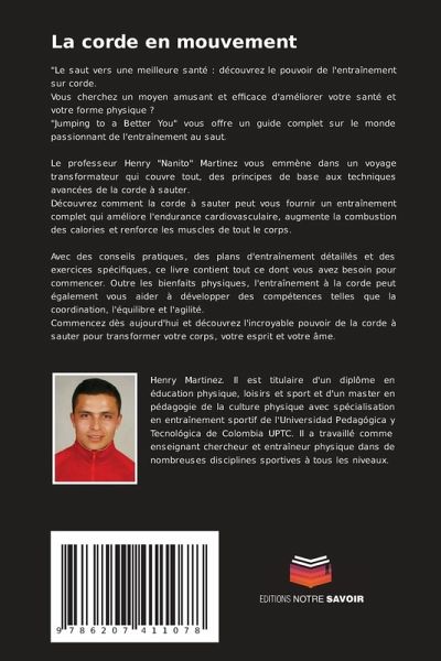 "Le saut vers une meilleure santé : découvrez le pouvoir de l'entraînement sur corde.Vous cherchez un moyen amusant et efficace d'améliorer votre santé et votre forme physique ? "Jumping to a Better You" vous offre un guide complet sur le monde passionnant de l'entraînement au saut.Le professeur Henry "Nanito" Martinez vous emmène dans un voyage transformateur qui couvre tout, des principes de base aux techniques avancées de la corde à sauter.Découvrez comment la corde à sauter peut vous fournir un entraînement complet qui améliore l'endurance cardiovasculaire, augmente la combustion des calories et renforce les muscles de tout le corps.Avec des conseils pratiques, des plans d'entraînement détaillés et des exercices spécifiques, ce livre contient tout ce dont vous avez besoin pour commencer. Outre les bienfaits physiques, l'entraînement à la corde peut également vous aider à développer des compétences telles que la coordination, l'équilibre et l'agilité.Commencez dès aujourd'hui et découvrez l'incroyable pouvoir de la corde à sauter pour transformer votre corps, votre esprit et votre âme.
