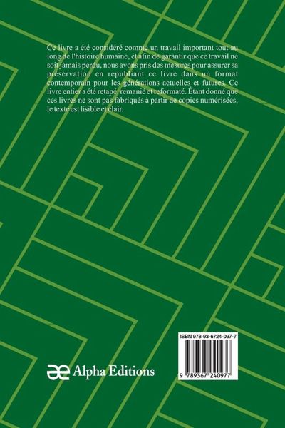 La coucaratcha (II/III)" est un livre classique, qui a eu une valeur significative tout au long de l'histoire, et pour garantir que sa sagesse intemporelle ne soit jamais perdue, Alpha Editions l'a soigneusement préservé en le republiant dans un format moderne et accessible aux générations présentes et futures. Soigneusement reformaté, retapé , et nouvellement conçue, cette édition offre un texte clair et lisible, sans copies numérisées de l'uvre originale, Alpha Editions se consacre à insuffler une nouvelle vie aux livres anciens et classiques, rendant ces trésors littéraires à nouveau disponibles pour les lecteurs qui chérissent l'histoire. culture et savoir intemporel.