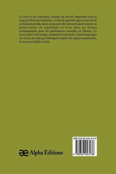 La coucaratcha (III/III)" est un livre classique, qui a eu une valeur significative tout au long de l'histoire, et pour garantir que sa sagesse intemporelle ne soit jamais perdue, Alpha Editions l'a soigneusement préservé en le republiant dans un format moderne et accessible aux générations présentes et futures. Soigneusement reformaté, retapé , et nouvellement conçue, cette édition offre un texte clair et lisible, sans copies numérisées de l'uvre originale, Alpha Editions se consacre à insuffler une nouvelle vie aux livres anciens et classiques, rendant ces trésors littéraires à nouveau disponibles pour les lecteurs qui chérissent l'histoire. culture et savoir intemporel.