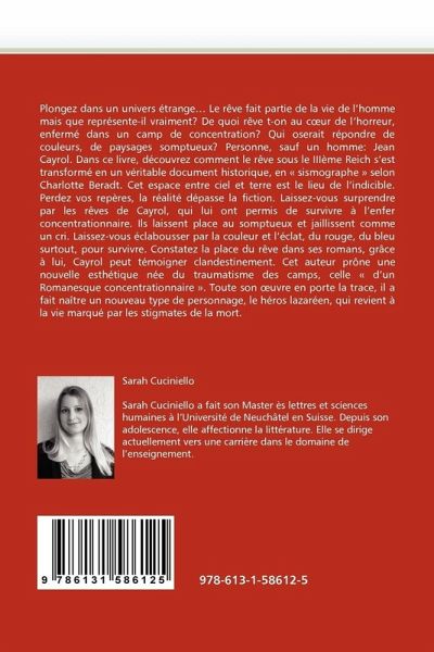 Plongez dans un univers étrange... Le rêve fait partie de la vie de l'homme mais que représente-il vraiment? De quoi rêve t-on au coeur de l'horreur, enfermé dans un camp de concentration? Qui oserait répondre de couleurs, de paysages somptueux? Personne, sauf un homme: Jean Cayrol. Dans ce livre, découvrez comment le rêve sous le IIIème Reich s'est transformé en un véritable document historique, en « sismographe » selon Charlotte Beradt. Cet espace entre ciel et terre est le lieu de l'indicible. Perdez vos repères, la réalité dépasse la fiction. Laissez-vous surprendre par les rêves de Cayrol, qui lui ont permis de survivre à l'enfer concentrationnaire. Ils laissent place au somptueux et jaillissent comme un cri. Laissez-vous éclabousser par la couleur et l'éclat, du rouge, du bleu surtout, pour survivre. Constatez la place du rêve dans ses romans, grâce à lui, Cayrol peut témoigner clandestinement. Cet auteur prône une nouvelle esthétique née du traumatisme des camps, celle « d'un Romanesque concentrationnaire ». Toute son oeuvre en porte la trace, il a fait naître un nouveau type de personnage, le héros lazaréen, qui revient à la vie marqué par les stigmates de la mort.