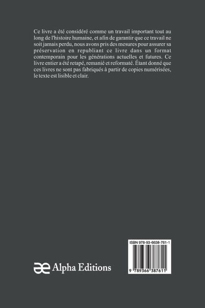 La Coupe; Lupo Liverani; Le Toast; Garnier; Le Contrebandier; La Rêverie à Paris"", constitue un phare dans le monde du livre, comblant le fossé entre le passé et le présent. Autrefois considéré parmi les livres anciens, cet ouvrage classique, comme tant de livres anciens et oubliés, a façonné notre compréhension de la culture et de l'histoire. exemple remarquable de livres d'histoire qui ont influencé des générations, et maintenant, grâce au dévouement d'Alpha Editions, votre éditeur de livres de confiance, il renaît dans un format frais et élégant. Nous avons soigneusement retapé, remanié et amélioré ce livre pour qu'il soit bien plus qu'un simple titre à lire. Vous pouvez désormais profiter de pages claires et faciles à lire, sans numérisation floue ni texte décoloré. En choisissant cette édition, vous investissez dans plus qu'un livre : vous sauvegardez un héritage. Votre soutien maintient en vie un morceau remarquable du patrimoine humain, garantissant que ses leçons et ses inspirations continuent de résonner dans le futur.