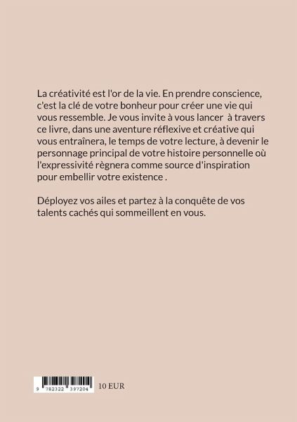 La créativité est l'or de la vie. En prendre conscience, c'est la clé de votre bonheur pour créer une vie qui vous ressemble. Je vous invite à vous lancer à travers ce livre, dans une aventure réflexive et créative qui vous entraînera, le temps de votre lecture, à devenir le personnage principal de votre histoire personnelle où l'expressivité règnera comme source d'inspiration pour embellir votre existence . Déployez vos ailes et partez à la conquête de vos talents cachés qui sommeillent en vous.