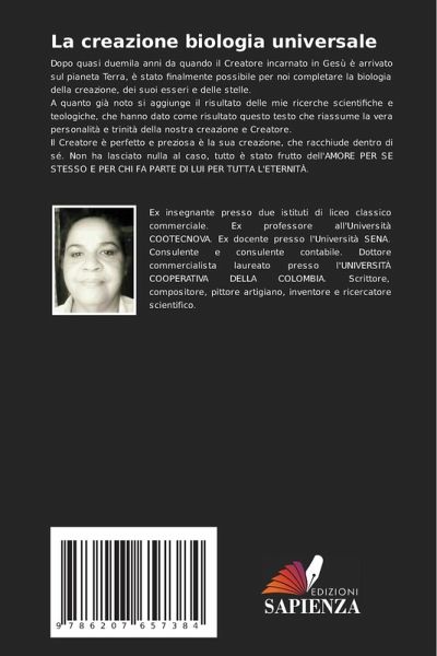 Dopo quasi duemila anni da quando il Creatore incarnato in Gesù è arrivato sul pianeta Terra, è stato finalmente possibile per noi completare la biologia della creazione, dei suoi esseri e delle stelle. A quanto già noto si aggiunge il risultato delle mie ricerche scientifiche e teologiche, che hanno dato come risultato questo testo che riassume la vera personalità e trinità della nostra creazione e Creatore.Il Creatore è perfetto e preziosa è la sua creazione, che racchiude dentro di sé. Non ha lasciato nulla al caso, tutto è stato frutto dell'AMORE PER SE STESSO E PER CHI FA PARTE DI LUI PER TUTTA L'ETERNITÀ.