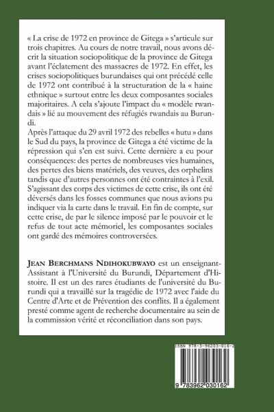" La crise de 1972 en province de Gitega " s'articule sur trois chapitres. Au cours de notre travail, nous avons décrit la situation sociopolitique de la province de Gitega avant l'éclatement des massacres de 1972. En effet, les crises sociopolitiques burundaises qui ont précédé celle de 1972 ont contribué à la structuration de la " haine ethnique " surtout entre les deux composantes sociales majoritaires. A cela s'ajoute l'impact du " modèle rwandais " lié au mouvement des réfugiés rwandais au Burundi. Après l'attaque du 29 avril 1972 des rebelles " hutu " dans le Sud du pays, la province de Gitega a été victime de la répression qui s'en est suivi. Cette dernière a eu pour conséquences: des pertes de nombreuses vies humaines, des pertes des biens matériels, des veuves, des orphelins tandis que d'autres personnes ont été contraintes à l'exil. S'agissant des corps des victimes de cette crise, ils ont été déversés dans les fosses communes que nous avions pu indiquer via la carte dans le travail. En fin de compte, sur cette crise, de par le silence imposé par le pouvoir et le refus de tout acte mémoriel, les composantes sociales ont gardé des mémoires controversées.