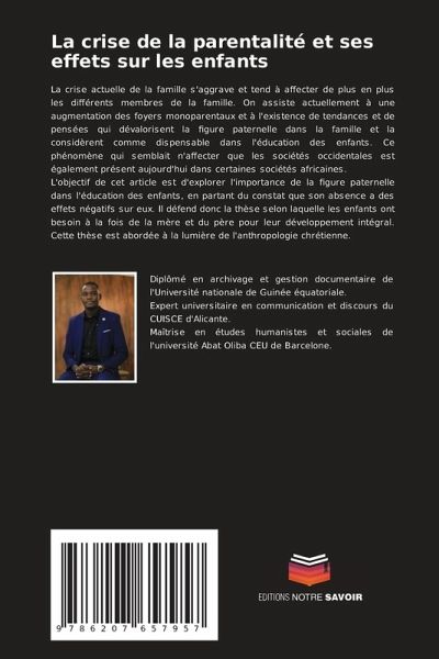 La crise actuelle de la famille s'aggrave et tend à affecter de plus en plus les différents membres de la famille. On assiste actuellement à une augmentation des foyers monoparentaux et à l'existence de tendances et de pensées qui dévalorisent la figure paternelle dans la famille et la considèrent comme dispensable dans l'éducation des enfants. Ce phénomène qui semblait n'affecter que les sociétés occidentales est également présent aujourd'hui dans certaines sociétés africaines.L'objectif de cet article est d'explorer l'importance de la figure paternelle dans l'éducation des enfants, en partant du constat que son absence a des effets négatifs sur eux. Il défend donc la thèse selon laquelle les enfants ont besoin à la fois de la mère et du père pour leur développement intégral. Cette thèse est abordée à la lumière de l'anthropologie chrétienne.