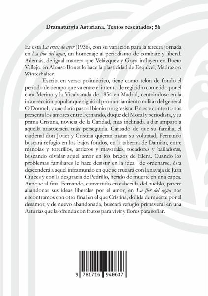 La crisis de ayer (1936) es un homenaje al periodismo de combate y a la plasticidad de Esquivel, Madrazo o Winterhalter. Escrita en verso polimétrico, acon-tece durante el magnicidio del cura Merino y la Vi-calvarada, centrándose en la insurrección popular que daría paso al bienio progresista, e ilustra los amores de Fernando, duque del Moral y periodista, con su prima Cristina, novicia de la Caridad y ampa-ro de la aristocracia. Cansado de que quieran matar su voluntad, Fernando buscará refugio en los bajos fondos, entre manolas y torerillos, arrieros y mayora-les, tocadores y bailadoras. Tras renunciar a ordenar-se, Cristina descenderá a aquel mundo, para cruzarse con la navaja de Juan Cruces y con la desgracia de Pedrillo, herido de muerte en una capea, pero conse-guirá que Fernando abandone sus ideas liberales por el amor. En La flor del agua Cristina, dolida de muer-te por el desamor y el abandonado, buscará un refu-gio primaveral que le ofrenda con frutos para vivir y flores para soñar.