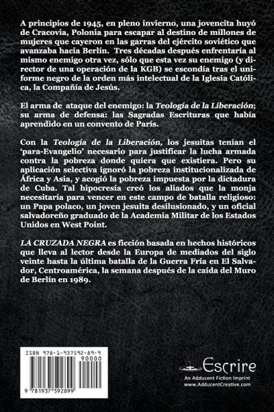 A principios de 1945, en pleno invierno, una jovencita huyó de Cracovia, Polonia para escapar al destino de millones de mujeres que cayeron en las garras del ejército soviético que avanzaba hacia Berlín. Tres décadas después enfrentaría al mismo enemigo otra vez, sólo que esta vez su enemigo (y director de una operación de la KGB) se escondía tras el uniforme negro de la orden más intelectual de la Iglesia Católica, la Compañía de Jesús. El arma de ataque del enemigo: la Teología de la Liberación; su arma de defensa: las Sagradas Escrituras que había aprendido en un convento de París. Con la Teología de la Liberación, los jesuitas tenían el 'para-Evangelio' necesario para justificar la lucha armada contra la pobreza donde quiera que existiera. Pero su aplicación selectiva ignoró la pobreza institucionalizada de África y Asia, y acogió la pobreza impuesta por la dictadura de Cuba. Tal hipocresía creó los aliados que la monja necesitaría para vencer en este campo de batalla religioso: un Papa polaco, un joven jesuita desilusionado, y un oficial salvadoreño graduado de la Academia Militar de los Estados Unidos en West Point. La Cruzada Negra es ficción basada en hechos históricos que lleva al lector desde la Europa de mediados del siglo veinte hasta la última batalla de la Guerra Fría en El Salvador, Centroamérica, la semana después de la caída del Muro de Berlín en 1989.