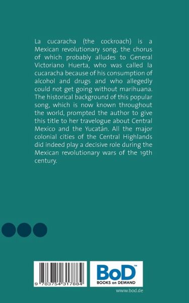 La cucaracha (the cockroach) is a Mexican revolutionary song, the chorus of which probably alludes to General Victoriano Huerta, who was called la cucaracha because of his consumption of alcohol and drugs and who allegedly could not get going without marihuana. The historical background of this popular song, which is now known throughout the world, prompted the author to give this title to her travelogue about Central Mexico and the Yucatán. All the major colonial cities of the Central Highlands did indeed play a decisive role during the Mexican revolutionary wars of the 19th century.