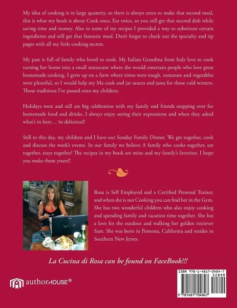 My idea of cooking is in large quantity, so there is always extra to make that second meal, this is what my book is about Cook once, Eat twice, so you still get that second dish while saving time and money. Also in some of my recipes I provided a way to substitute certain ingredients and still get that fantastic meal. Don't forget to check out the specialty and tip pages with all my little cooking secrets. My past is full of family who loved to cook. My Italian Grandma from Italy love to cook turning her home into a small restaurant where she would entertain people who love great homemade cooking. I grew up on a farm where times were tough, tomatoes and vegetables were plentiful, so I would help my Ma cook and jar sauces and jams for those cold winters. Those traditions I've passed onto my children. Holidays were and still are big celebration with my family and friends stopping over for homemade food and drinks. I always enjoy seeing their expressions and when they asked what's in here... its delicious!! Still to this day, my children and I have our Sunday Family Dinner. We get together, cook and discuss the week's events. In our family we believe A family who cooks together, eat together, stays together! The recipes in my book are mine and my family's favorites. I hope you make them yours!!