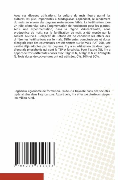 Avec ses diverses utilisations, la culture de maïs figure parmi les cultures les plus importantes à Madagascar. Cependant, le rendement du maïs au niveau des paysans reste encore faible. La fertilisation joue un rôle primordial dans l'augmentation de rendement pour les plantes. Ainsi une expérimentation, dans la région Vakinankaratra, zone productrice de maïs, sur la fertilisation de maïs a été menée par la société AGRIVET. L'objectif de l'étude est de connaître les effets des différentes fertilisations sur le maïs. Différentes combinaisons et doses d'engrais avec des couvertures ont été testées sur le maïs IRAT 200, une variété déjà adoptée par les paysans. Il y a eu utilisation de deux types d'engrais phosphatés qui sont le TSP et la calcite. Pour l'azote (N), il y a apport de trois différentes doses avec 0Kg/Ha N, 60Kg/Ha N et 120Kg/Ha N. Trois doses de couvertures ont été utilisées, 0%, 30% et 60%.