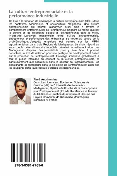 Ce livre a la vocation de développer la culture entrepreneuriale (DCE) dans les contextes économique et socioculturel malgaches. Une culture entrepreneuriale qui pourrait s analyser aussi bien à travers le comportement entrepreneurial de l entrepreneur-dirigeant lui-même que par la culture et les dispositifs d appui à l entrepreneuriat dans le milieu industriel. L analyse relationnelle entre culture entrepreneuriale, entrepreneur et performance des entreprises se trouve au centre de la problématique. L enquête empirique est centrée sur les MPMI agroalimentaires dans trois Régions de Madagascar. Le choix répond au souci de la crise alimentaire mondiale prévalant actuellement alors que Madagascar dispose des potentialités pour y faire face. Il pourrait constituer un axe de réflexion pour une politique de développement basée sur la promotion de l entrepreneuriat. L ouvrage s adresse globalement à tout le public intéressé au concept de la culture entrepreneuriale, et particulièrement aux opérateurs dans le secteur de l agroalimentaire, les enseignants et chercheurs dans la discipline de l entrepreneuriat ainsi que les étudiants dans leurs travaux d études entrepreneuriales.