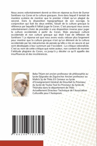 Nous avons volontairement donné ce titre en réponse au livre de Oumar Sankhare «Le Coran et la culture grecque», livre dans lequel il tentait de manière scolaire de montrer que le premier n'était qu'un plagiat du second. Dans la disposition topographique de son ouvrage, la conjonction qui liait les deux entités, faisait de la culture grecque la référence par laquelle il fallait juger le Coran. C'est pourquoi nous avons volontairement choisi de procéder à une disposition inverse pour juger la culture occidentale à partir du Coran. Mais pourquoi culture occidentale et non culture grecque qui était l'axe de réflexion de Sankhare ? La réponse est que nous avons voulu ratisser plus largement pour montrer que la culture grecque n'est qu'un élément de la culture occidentale par les mécanismes de pensée qu'elle a mis en oeuvre et qui sont développés à leur summum par l'occident : La critique rationaliste. C'est au nom de cette critique que notre auteur, non content de montrer l'attitude plagiaire du Coran, va jusqu'à y déceler ce qu'il appelle des insuffisances et des incohérences.