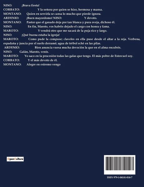 NISO: ¡Brava fiesta! CORBATO: Y la señora por quien se hizo, hermosa y mansa. MONTANO: Quien en servirla se cansa lo mucho que pierde ignora. ARDENIO: ¡Buen mayordomo! NISO: Y devoto. MONTANO: Pastor que el ganado deja por tan blanca y pura oveja, dichoso él. NISO: En fin, Maroto, vos habéis dejado el cargo con honra y fama. MAROTO: Y vendrá otro que me sacará de la puja rico y largo. NISO: ¡Qué buena estaba la igreja! MAROTO: Como pude la compuse; claveles en ella puse desde el altar a la reja. Verbena, espadaña y juncia por el suelo derramé; agua de trébol eché en las pilas. ARDENIO: Bien anuncia vuesa mucha devoción la que en el alma encubrís. NISO: Galán, Maroto, venís. MAROTO: Yo saco en la procesión todas las galas que tengo. El más pobre de Estercuel soy. CORBATO: Y el más devoto de él. MONTANO: Alegre en extremo vengo