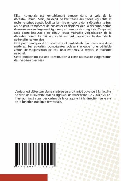 L'Etat congolais est véritablement engagé dans la voie de la décentralisation. Mais, en dépit de l'existence des textes législatifs et réglementaires censés faciliter la mise en oeuvre de la décentralisation, on ne peut s'empêcher de constater et déplorer que la décentralisation demeure encore largement ignorée par nombre de congolais. Ce qui est sans doute imputable au défaut d'une véritable vulgarisation de la décentralisation. Le même constat est fait concernant le droit de la nationalité congolaise. C'est pour pourquoi il est nécessaire et souhaitable que, dans cers deux matières, les autorités compétentes puissent engager une véritable action de vulgarisation de ces deux matières, à travers le territoire national. Cette publication est une contribution à cette nécessaire vulgarisation des matières précitées.