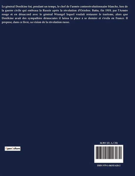 Le général Denikine fut, pendant un temps, le chef de l'armée contrerévolutionnaire blanche, lors de la guerre civile qui embrasa la Russie après la révolution d'Octobre. Battu, fin 1919, par l'Armée rouge et en désaccord avec le général Wrangel lequel voulait restaurer le tsarisme, alors que Denikine avait des sympathies démocrates il laissa la place à se dernier et s'exila en France. Il propose, dans ce livre, sa vision de la révolution russe. Anton Ivanovitch Dénikine (1872-1947) est un général russe, chef d'état-major dans les armées de la Russie impériale pendant la Première Guerre mondiale, commandant en chef de l'armée des volontaires pendant la guerre civile russe. Lors de la révolution de Février 1917, il se trouvait sur le front roumain. En mars 1917, il fut rappelé à Pétrograd par le ministre de la guerre du gouvernement provisoire Alexandre Goutchkov qui lui proposa le poste de chef d'état-major auprès du commandant en chef de l'armée russe, le fraîchement nommé général Mikhail Alekseïev. Le 5 avril, Dénikine entra en fonction, qu'il exerça un mois et demi, en bonne entente avec Alekseïev. Après le remplacement d'Alekseïev par Broussilov, Dénikine, ne souhaitant pas être le chef d'état-major de ce dernier, fut nommé commandant des armées du front ouest. À ce poste, il organisa le soutien stratégique du front sud-ouest lors de l'offensive de juin 1917. Le 28 août 1917, il est arrêté à la suite d'un télégramme expédié au gouvernement provisoire dans lequel il exprime sa solidarité avec le général Lavr Kornilov. Accusé de mutinerie (Affaire Kornilov), il fut incarcéré en compagnie de Kornilov à la prison de Bykhov, d'où les généraux réclamaient un procès public pour se laver des accusations mensongères et présenter leur programme pour l'avenir de la Russie. Après la chute du gouvernement provisoire, l'accusation de mutinerie devint sans objet et, le 2 décembre 1917, le commandant de chef général Nikolaï Doukhonine donna l'ordre de transférer les prisonniers sur le Don, ce que contesta le comité des armées. Apprenant que des unités bolchéviques aux ordres de l'enseigne Krylenko marchaient sur Moguilev, menaçant d'exécuter les généraux, ceux-ci se décidèrent à fuir vers le Don. Avec des papiers au nom d'Alexandre Dombrowski, Dénikine parvint à déjouer la vigilance des contrôles bolchéviques et à rallier Novotcherkassk, où il participa à la formation de l'armée des volontaires. Le 4 avril 1920, Dénikine, face à l'opposition des généraux, démissionne du commandement des Forces Armées du Sud de la Russie au profit du lieutenant-général baron Wrangel et s'embarqua le jour même pour l'Angleterre via Constantinople. Il s'exile en France, puis émigre aux États-Unis en 1945.