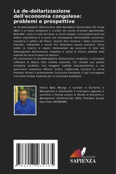 La de-dollarizzazione dell'economia della Repubblica Democratica del Congo (RDC) è un tema complesso e cruciale che merita un'analisi approfondita. Nella RDC, come in molti altri Paesi in via di sviluppo, l'uso predominante del dollaro statunitense è in parte una conseguenza dell'instabilità economica, monetaria e politica del Paese. Questo libro esamina i fattori economici, finanziari, istituzionali e sociali che influenzano questo processo. Cerca inoltre di chiarire le ragioni fondamentali del processo di lotta alla dollarizzazione dell'economia congolese e valuta le misure adottate dalle autorità nel corso di quasi tre decenni.Per promuovere la de-dollarizzazione dell'economia congolese, è essenziale rafforzare la fiducia nella moneta nazionale. Ciò richiede una politica monetaria prudente, una maggiore stabilità macroeconomica e una governance economica efficace. Inoltre, migliorando l'accesso ai servizi finanziari formali e promuovendo l'inclusione finanziaria si può incoraggiare l'uso della moneta nazionale per le transazioni quotidiane.