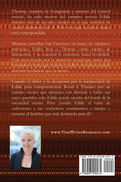 Thomas, vampiro de Scanguards y maestro del control mental, ha sido mentor del vampiro novato Eddie durante más de un año, tiempo en el que también ha estado enamorado de él. Pero cree que su amor nunca será correspondido. Mientras patrullan San Francisco en busca de vampiros malvados, Eddie besa a Thomas como táctica de distracción, y su reacción lo estremece hasta la médula. Está aterrorizado por la atracción sexual que siente por su mentor y teme que avanzar y ceder a sus deseos pueda destruir la relación que ya tienen. Cuando el dolor y la decepción por la incapacidad de Eddie para comprometerse llevan a Thomas por un camino oscuro que amenaza con destruir a todos sus seres queridos, solo Eddie puede sacarlo del borde de la oscuridad eterna. Pero ¿tendrá Eddie el valor de enfrentarse a sus verdaderos sentimientos a tiempo y rescatar al hombre que está destinado para él? Vampiros de Scanguards La Mortal Amada de Samson (#1) La Revoltosa de Amaury (#2) La Compañera de Gabriel (#3) El Refugio de Yvette (#4) La Redención de Zane (#5) El Eterno Amor de Quinn (#6) El Hambre de Oliver (#7) La Decisión de Thomas (#8) Mordida Silenciosa (#8 ¿) La Identidad de Cain (#9) El Retorno de Luther (#10) La Promesa de Blake (#11) Reencuentro Fatídico (#11 ¿) El Anhelo de John (#12) La Tempestad de Ryder (#13) La Conquista de Damian (#14) El Reto de Grayson (#15) El Amor Prohibido de Isabelle (#16) La Pasión de Cooper (#17) La Valentía de Vanessa (#18) Deseo Mortal (Storia breve) Guardianes Invisibles Amante Descubierto (#1) Maestro Desencadenado (#2) Guerrero Desentrañado (#3) Guardián Descarriado (#4) Inmortal Develado (#5) Protector Inigualable (#6) Demonio Desatado (#7) Vampiros de Venecia Raphael e Isabella (#1) Dante y Viola (#2) Lorenzo y Bianca (#3) Nico y Oriana (#4) Fuera del Olimpo Un Toque Griego (#1) Un Aroma a Griego (#2) Un Sabor Griego (#3) Un Silencio Griego (#4) El Club de los Solteros Código Stargate Time Quest Thriller: Testigo Ocular La serie Vampiros de Scanguards está llena de acción trepidante, escenas de amor ardientes, diálogos ingeniosos y héroes y heroínas fuertes. El vampiro Samson Woodford vive en San Francisco y es dueño de Scanguards, una empresa de seguridad y guardaespaldas que emplea tanto a vampiros como a humanos. Y, con el tiempo, también a algunas brujas. ¡Agrega unos cuantos guardianes y demonios inmortales más tarde en la serie, y ya te harás una idea! Cada libro puede leerse de manera independiente, ya que siempre se centra en una nueva pareja encontrando el amor. Sin embargo, la experiencia es mucho más enriquecedora si los lees en orden. Y, por supuesto, siempre hay algunas bromas recurrentes. Lo entenderás cuando conozcas a Wesley, un aspirante a brujo. Amor a primera vista, de enemigos a amantes, encuentros divertidos, insta-amor, héroes alfa, parejas predestinadas, guardaespaldas, hermandad, damiselas en apuros, mujeres en peligro, la bella y la bestia, identidades ocultas, almas gemelas, primeros amores, vírgenes, héroes torturados, diferencias de edad, segundas oportunidades, amantes en duelo, regresos del más allá, bebés secretos, playboys, secuestros, de amigos a amantes, salidas del clóset, admiradores secretos, últimos en enterarse, amores no correspondidos, amnesia, realeza, amores prohibidos, gemelos idénticos, y compañeros en la lucha contra el crimen.