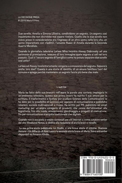 "Quello che conta è che sono al sicuro adesso ed ancora una volta è riuscita a proteggere la sua sorellina." Due sorelle, Amelia e Simona Lillostra, condividono un segreto. Un segreto così inquietante che non dovrebbe mai essere rivelato. Quello che le due sorelle non avevo preso in considerazione era l'ingresso di un altro uomo nella loro vita, un uomo imparentato con Vladimir, l'amante Russo di Amelia durante la Seconda Guerra Mondiale. Quando la giornalista televisiva Larissa Mina incontra Alexey Dubrovsky ad una cerimonia di premiazione, nessuno di loro immagina quale segreto si celi nel loro passato. Qual è l'oscuro segreto di famiglia e come ha potuto separare due sorelle così unite? Larissa ed Alexey involontariamente vengono a conoscenza del segreto. Separerà anche loro due? Questa è una storia di identità, di un amore familiare fuori dal comune e spiega perché mantenere un segreto faccia più bene che male.