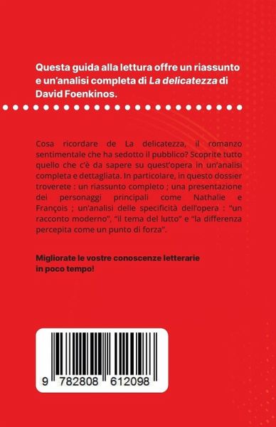 Cosa ricordare de La delicatezza, il romanzo sentimentale che ha sedotto il pubblico? Scoprite tutto quello che c'è da sapere su quest'opera in un'analisi completa e dettagliata. In particolare, in questo dossier troverete - Un riassunto completo - Una presentazione dei personaggi principali come Nathalie e François - Un'analisi delle specificità dell'opera: un racconto moderno, il tema del lutto e la differenza percepita come un punto di forza Un'analisi dei riferimenti per comprendere rapidamente il significato dell'opera.