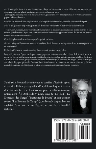 - Je m'appelle Azor et je suis d'Alexandrie, dis-je en lui tendant la main. Il la serra un moment, en soutenant ce regard affable que j'avais trop peu croisé dans ce pays. - Je m'appelle Jésus et je suis d'ici. Bienvenue Azor, ça doit être tout une expérience de te retrouver dans un pays si différent du tien ? En effet, j'en apprends tous les jours mais, si les inquiétudes se répètent, seules les coutumes changent. Mais je me gardai de trop parler, par crainte de me voir critiquer les murs locales et de l'offenser. - Tu as raison, mon ami, nous vivons tous le même temps et nous sommes soumis aux mêmes craintes et aux mêmes appréhensions. Après tout, nous sommes des hommes et apprenons les uns des autres, les bonnes comme les mauvaises coutumes... Cela allait plus dans le sens de mes pensées, puis il enchaîna : - Le seul refuge de l'homme est au sein de Son Dieu, là où il trouve le soulagement de ses peines et peurs, tu ne trouves pas ? Il m'avait piégé sans le vouloir, ou alors il soupçonnait quelque chose [...] Lorsqu'il quitte son Égypte natale pour accompagner un ami dans sa famille à Nazareth, le jeune Azor ne se doute pas encore qu'il fera une rencontre qui bouleversera sa vie. Son amitié avec un certain Jésus l'amènera à partir plus loin encore, jusque dans les hauteurs de l'Himalaya, la demeure des neiges... Récit initiatique aux allures d'épopée spirituelle, l'opus de Sami Yvan Mourad se lit comme un roman d'aventures. Si l'on connaît la trame de son histoire, on se laisse envoûter par ces trajectoires hors du commun.